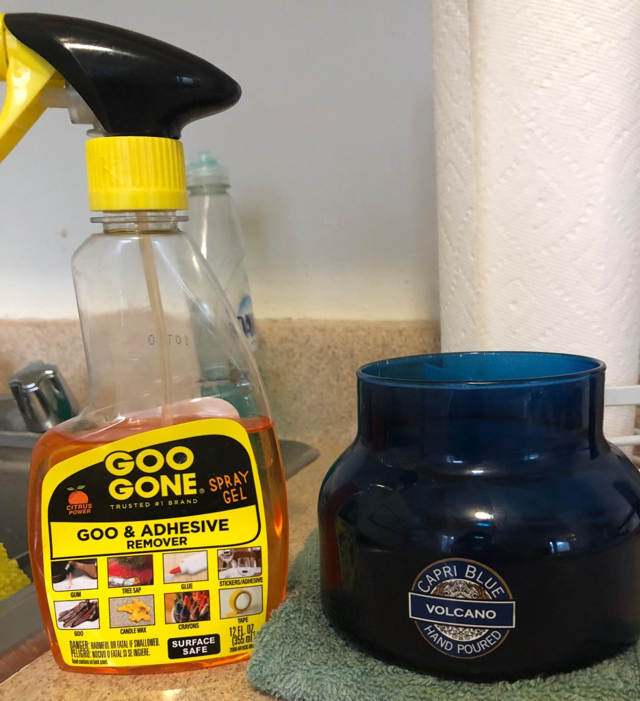 - You’re almost there! Now it is time to remove labels. Soak the jar in hot water, dry off a bit, and then spray with Goo Gone